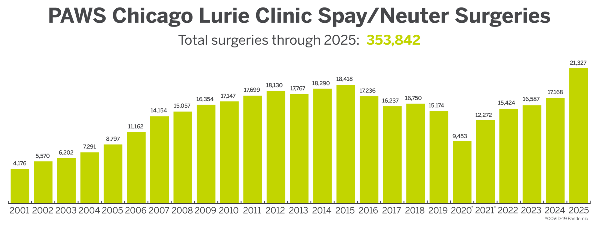 Last year, the PAWS Chicago Lurie Spay/Neuter Clinic performed an unprecedented 21,327 spay/neuter surgeries—a 24.2% increase over 2024 and the highest annual total in our history.