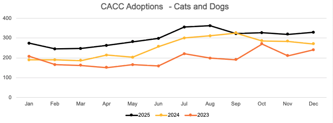 2025 became CACC’s most successful adoption year to date, with 3,626 adoptions—a 20% annual increase and thousands more second chances.