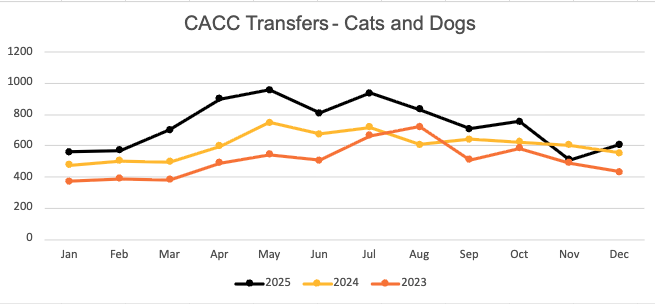 In 2025, 22% more pets were transferred to other rescues than in 2024, representing 1,606 additional animals.