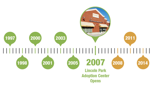 On September 7, 2007, PAWS Chicago opened the cageless, state-of-the-art Pippen Fasseas Adoption Center at 1997 N. Clybourn.