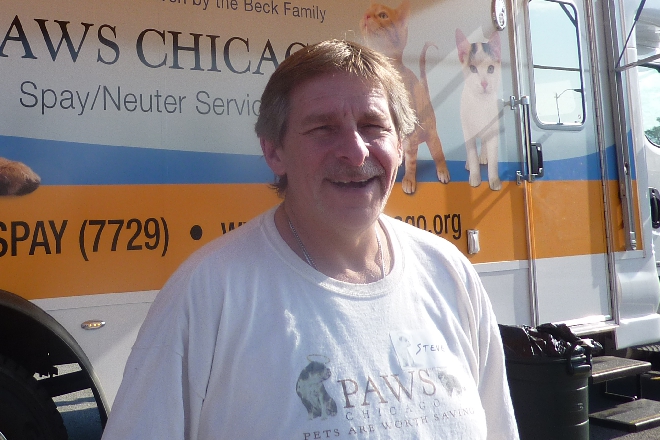 I wanted to volunteer for the past couple of years. So, one night I sat down in front of the computer, typed in ‘Chicago volunteering’ and PAWS Chicago was the first organization that popped up. I read what PAWS was about and here I am. I started volunteering for PAWS in April 2011. I volunteer every Sunday at the GusMobile and have undergone Dog town Level 1 training. I’d like to also take the Kitty City Level 1 training and volunteer at the Rescue & Recovery Center.