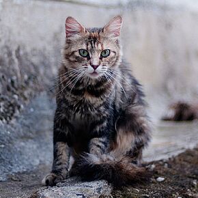 A stray cat was once a pet. He can be re-socialized and adopted. A stray cat is likely to approach you, although not close enough for you to touch him. If you put food down, a stray cat will likely start to eat right away. He is often vocal—sometimes talking insistently—and may look disheveled, as if he is unaccustomed to dealing with the conditions of the street. A stray can be seen at all times of the day.