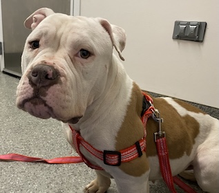 Mamas, a large and lovable white pit bull terrier with adorable brown spots, wiggled her way through the doors at Chicago Animal Care and Control (CACC) on a cold February day. But instead of being routinely processed as another large dog entering the city impoundment facility, a PAWS Chicago team member was there to help.