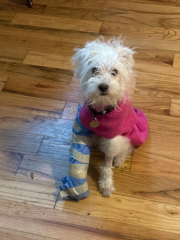 When a tiny, four-month-old scruffy white puppy was left behind at one of our veterinary partner clinics, the staff immediately knew something was wrong. Cosmo wasn’t just frightened and alone, he was in pain. X-rays revealed a fractured leg, the kind of injury that needs urgent care and a team ready to act fast.