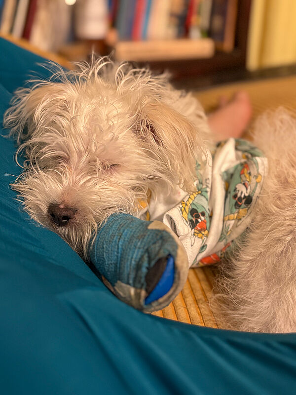 She welcomed Cosmo into her home, giving him a quiet space to rest, daily medication, slow supervised walks, and all the love a recovering puppy could ask for. With each passing week, he started to reveal who he truly is: curious, cuddly, and endlessly resilient. And somewhere between the bandage changes and belly rubs… she fell in love.