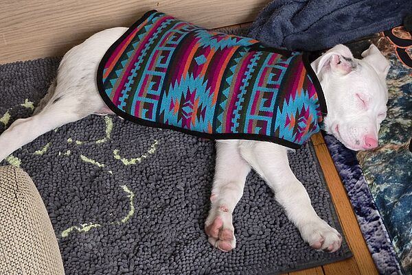 Since going home, Pretzel has been renamed “LouGnar.” His adopters have thoughtfully supported his continued recovery. “We’ve created a padded indoor play area so his remaining limbs don’t take too much impact while he runs around. We’ve also noticed he prefers pavement to grass, so we’re mindful of managing that to avoid strain. His bone helps with teething, and puzzle toys keep him mentally focused and calm.”