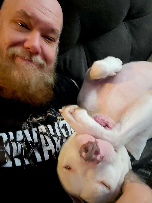 Clint didn’t come to PAWS intending to adopt. He was dropping off an annual donation of dog and cat food collected by the employees at his work. “Unfortunately, a month prior to this event, I lost my 2 beautiful pitties, Mandy and Cashew, to illness. I told my wife, Meagan, I wasn’t sure if I was ready for a new adoption, but I’d look.”