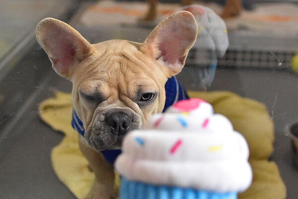 Today, we’re celebrating these fifteen French Bulldog puppies who, after more than three weeks in our care, are at the end of their quarantine period. They’ve come such a long way in their tumultuous journey to safety that it was only fitting to throw them their very own party, complete with chomp-pagne and pupcake toys.