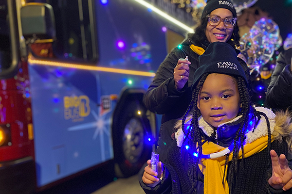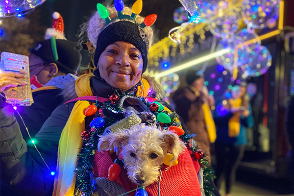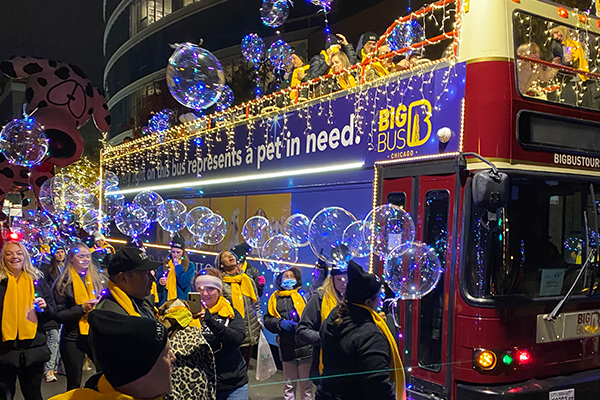 Outfitted with thousands of festive lights, the double-decker bus carried dozens of excited PAWS Chicago supporters on the open second deck, while nearly 100 PAWS Chicago supporters—plus their four-legged friend —walked along the bus and waved at the crowd.