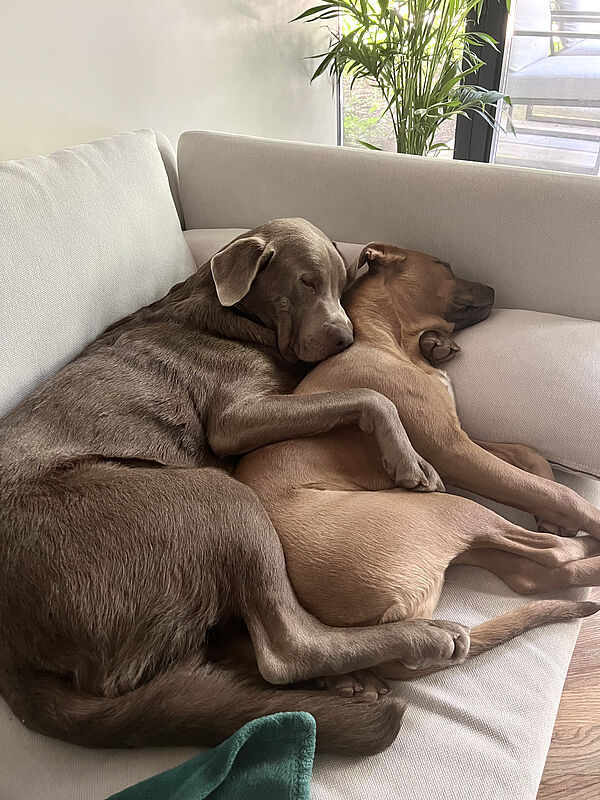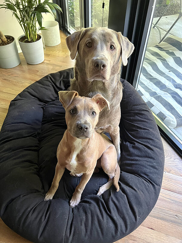 “She loves playing with her big brother, Loki. Despite being half his weight, Kaia always beats him at tug-of-war. She loves to lay on the grass in the middle of our walks. And she loves to cuddle and is convinced she’s a lap dog.”