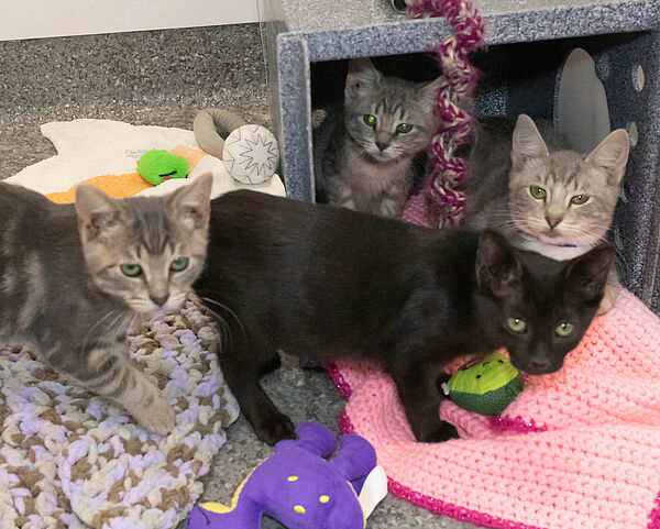 Trish, Totoro, Tiger Lily and Trent have survived more than any four-month-old kittens should be faced with. Our Community Outreach team found them fending for themselves outside. One look at their sad, crusty faces and we knew they needed care. Once safe at the PAWS Chicago Medical Center, our veterinarians diagnosed them with Upper Respiratory Infections and conjunctivitis.