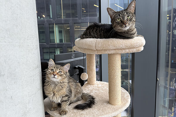 She loves eating and she can play with a cat wand for hours. She also loves running up and down the cat tree with her sister. And she could lay on your lap for hours.