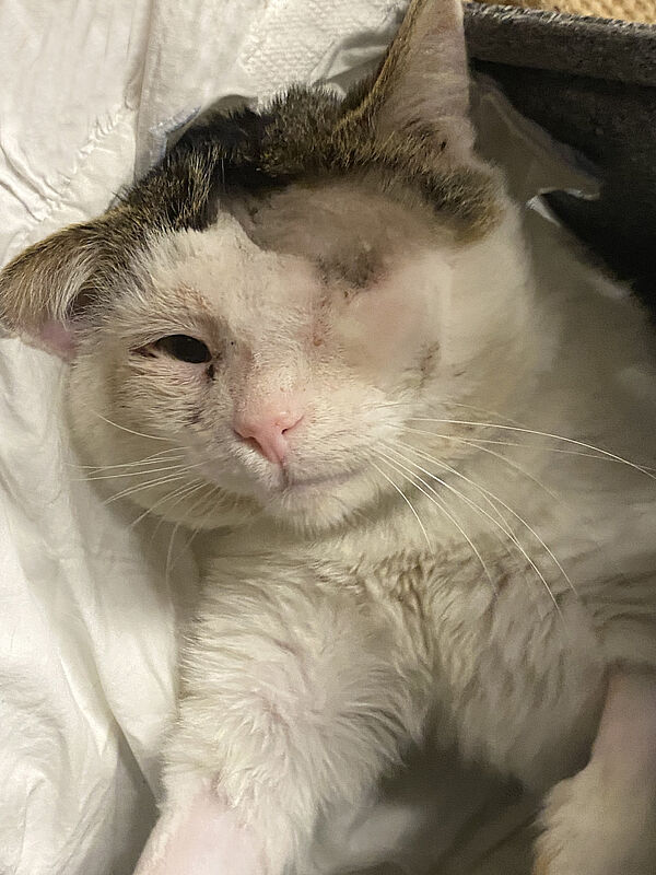 After an emergency enucleation, Doug was a different cat! Happy, playful, snuggly, it was so clear he was relieved to finally be pain free. Once he had fully recovered, Doug only spent one afternoon at our Adoption Center before he was scooped up by a loving adopter!