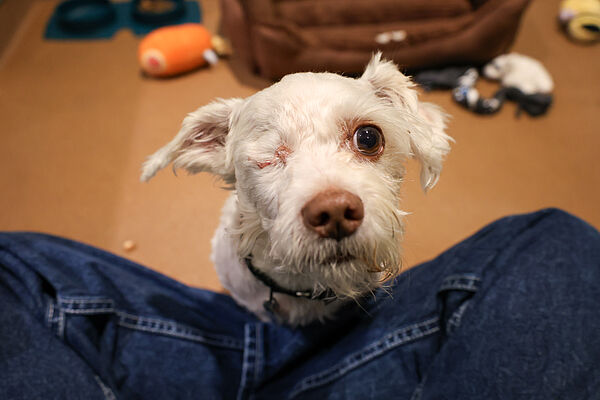 Thanks to PAWS Chicago’s expert medical team, Turnip received the care he needed, including enucleation surgery for his injured eye. After that, everything changed, and the once-shutdown pup suddenly sought a warm lap to cuddle in. It was clear Turnip had taken a turn for the better. We knew a foster home would be the perfect environment to help him continue to grow.