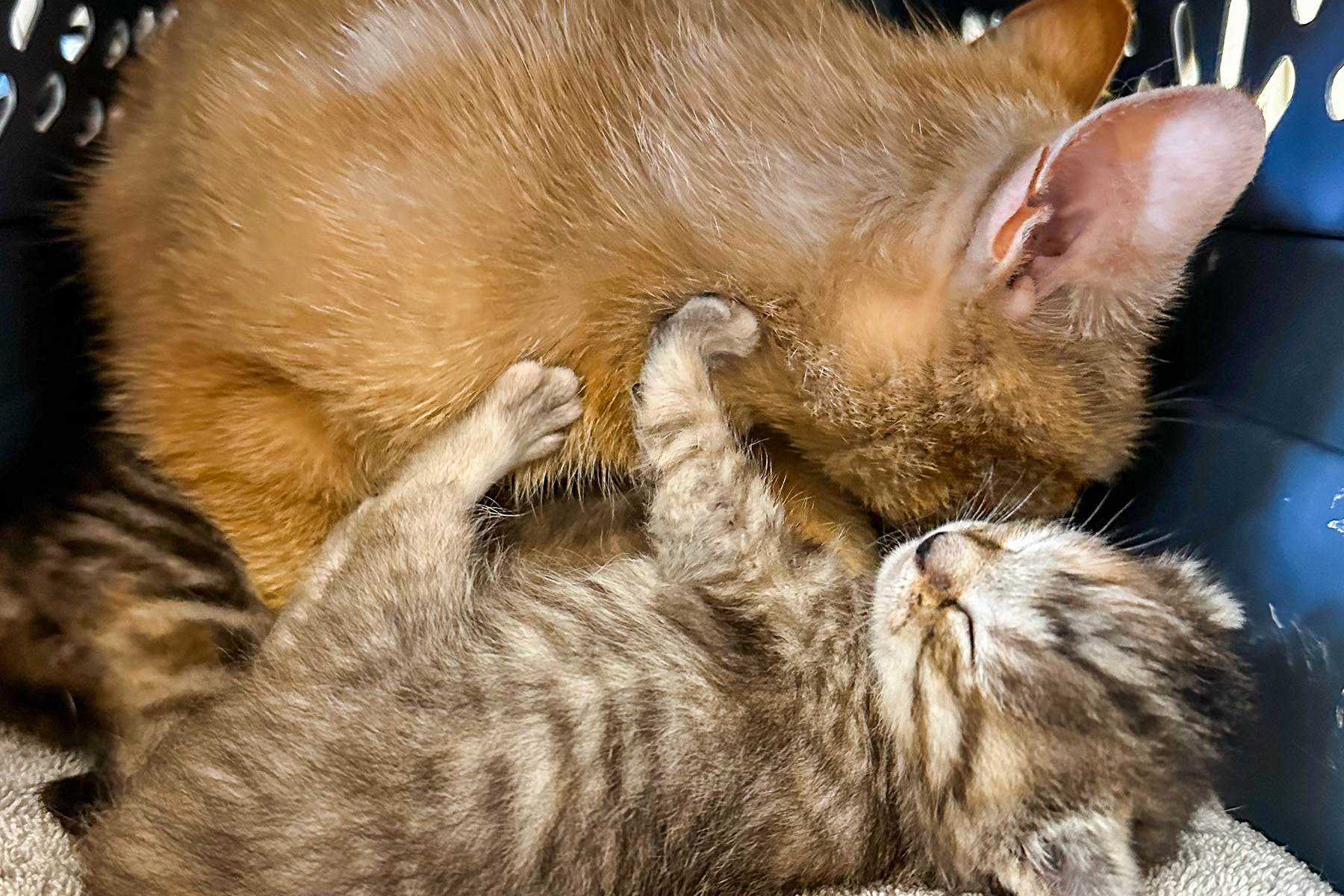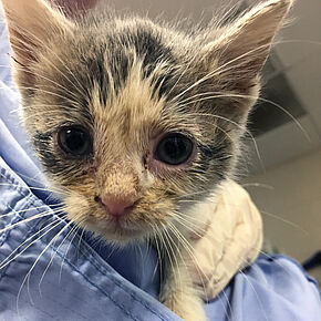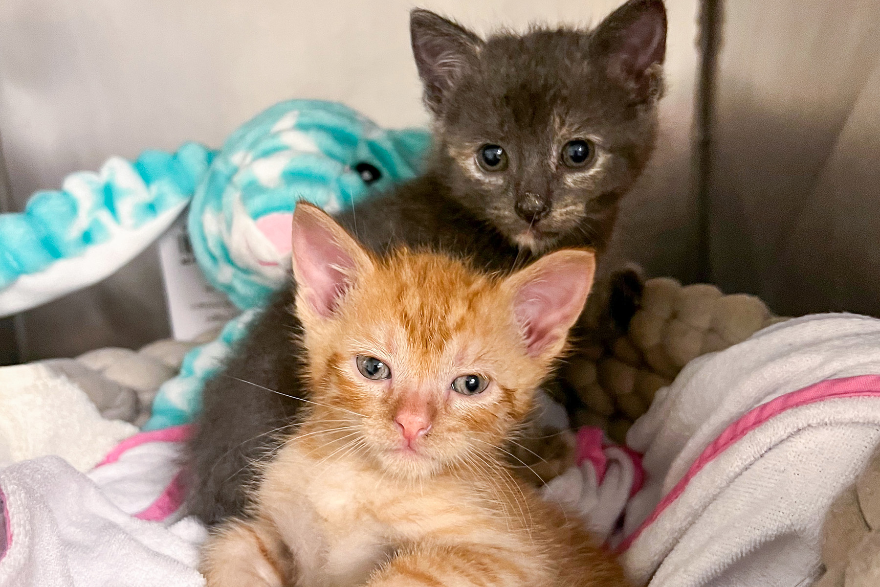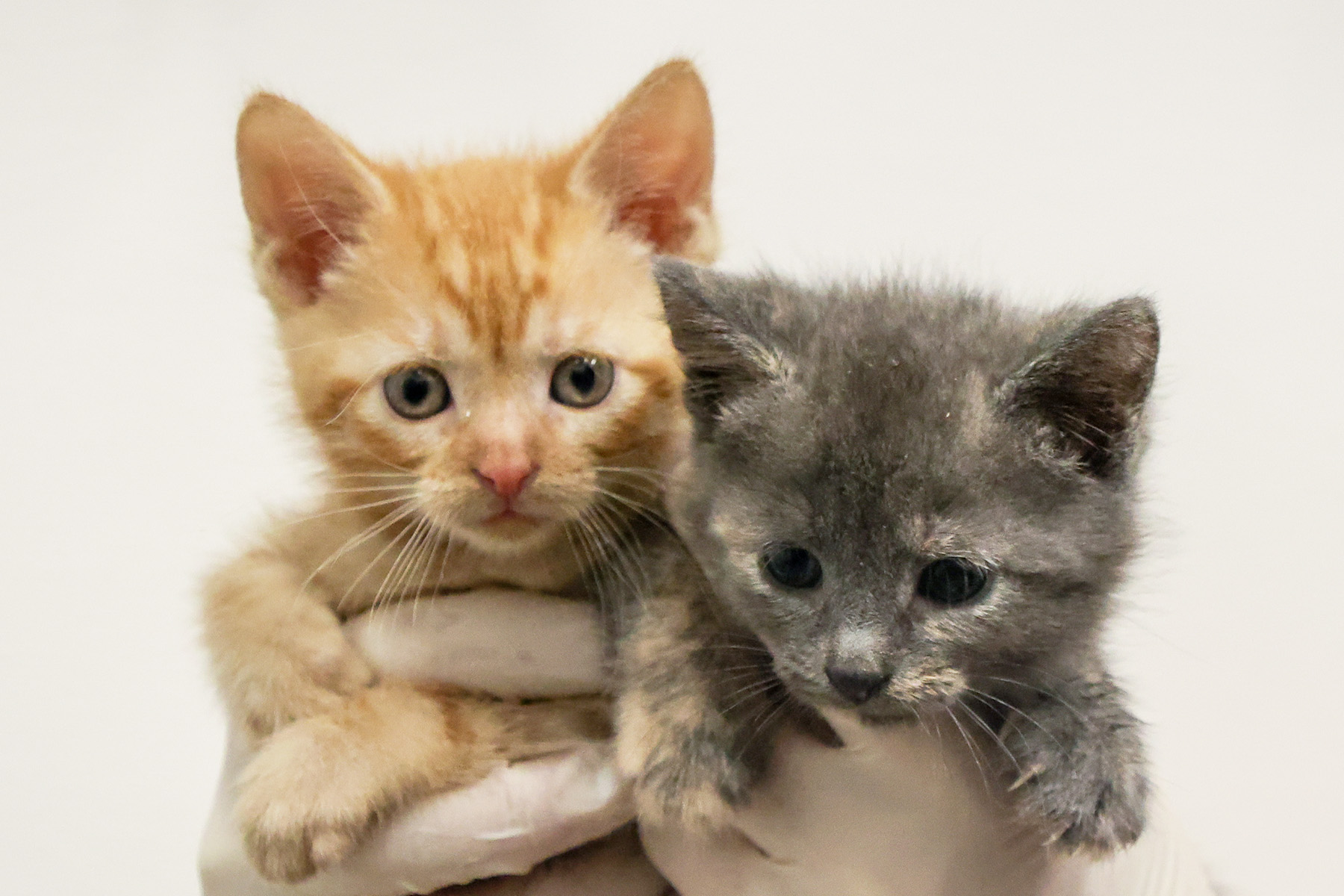 - Two 6-week-old kittens, Kiki and Katz, who were found inside the wall of an abandoned apartment. The residents of the apartment were evicted and abandoned the kittens. Thankfully, neighbors heard meows coming from the apartment but couldn’t find the kittens. Upon searching, rescuers realized the cats were hiding in the walls of the apartment and had to kick in the sheet rock to save them.