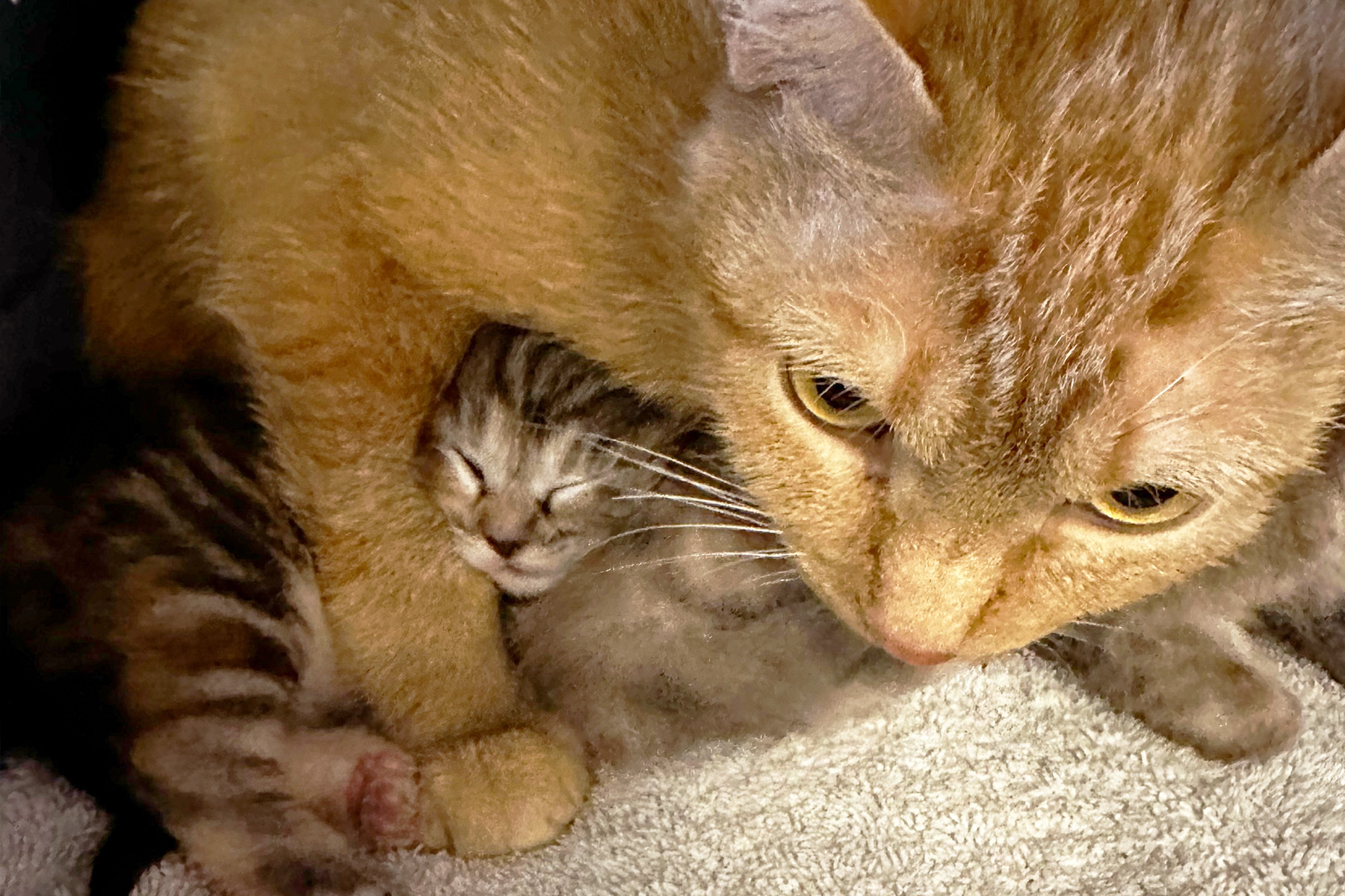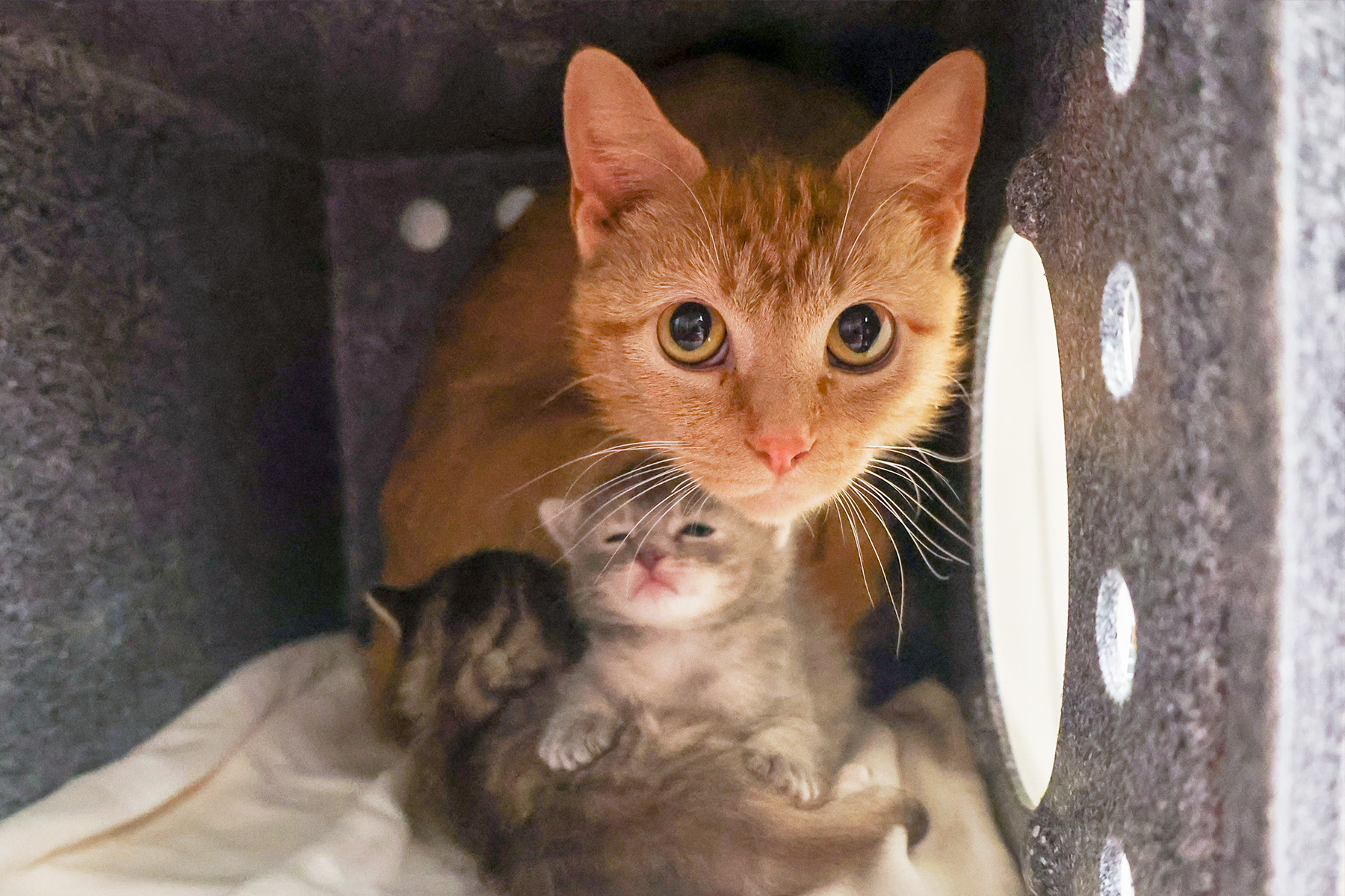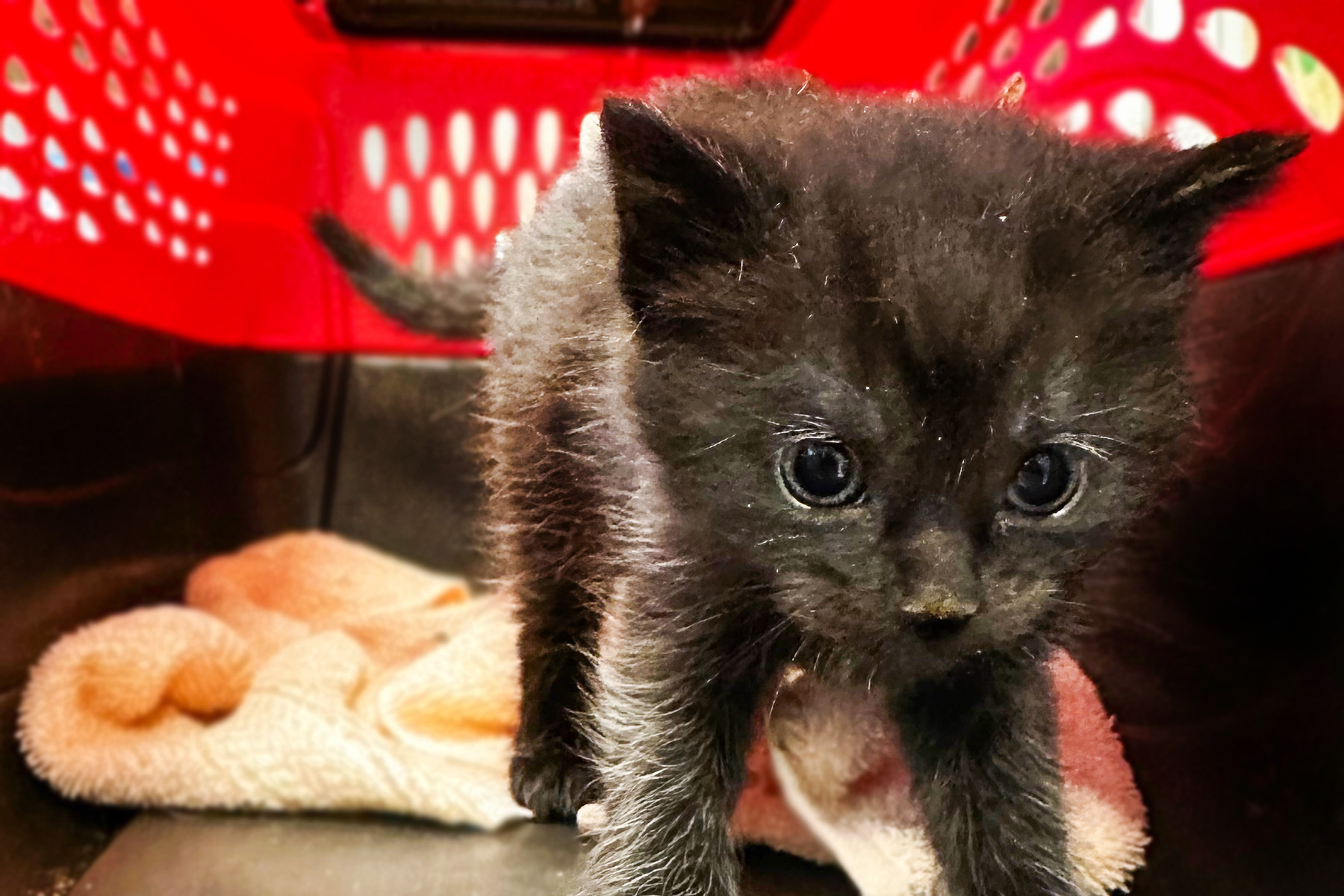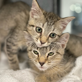 - Two 6-week-old kittens, Kiki and Katz, who were found inside the wall of an abandoned apartment. The residents of the apartment were evicted and abandoned the kittens. Thankfully, neighbors heard meows coming from the apartment but couldn’t find the kittens. Upon searching, rescuers realized the cats were hiding in the walls of the apartment and had to kick in the sheet rock to save them.