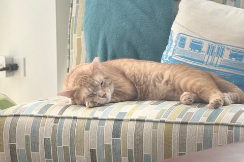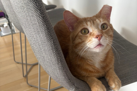 Franklin (formerly known as Monday) is a great cat and a great addition to our family! He’s such a curious boy, he’s always interested in any new sounds or goings on. He’s obsessed with our printer! His favorite things are playing with all his catnip toys, making air biscuits, and watching what’s going on in the kitchen from one of our stools. Our favorite thing is how he loves to steal my husband's socks at night and proudly present them to me. It’s adorable!! Thanks so much for rescuing this sweet boy so we could adopt him.