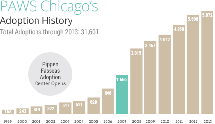 At PAWS Chicago, we keep working to grow our operations to save more homeless pets. It's how we've gone from saving a few dozen to 6,000 pets a year. But it is our adopters who make the real magic happen by bringing these loving pets home. Adopt a pet and spread the word!