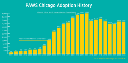 At PAWS Chicago, we keep working to grow our operations to save more homeless pets. It's how we've gone from saving a few dozen to 5,000 pets a year. But it is our adopters who make the real magic happen by bringing these loving pets home. Adopt a pet and spread the word!